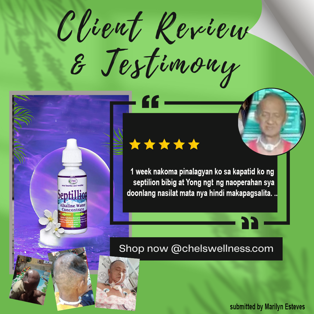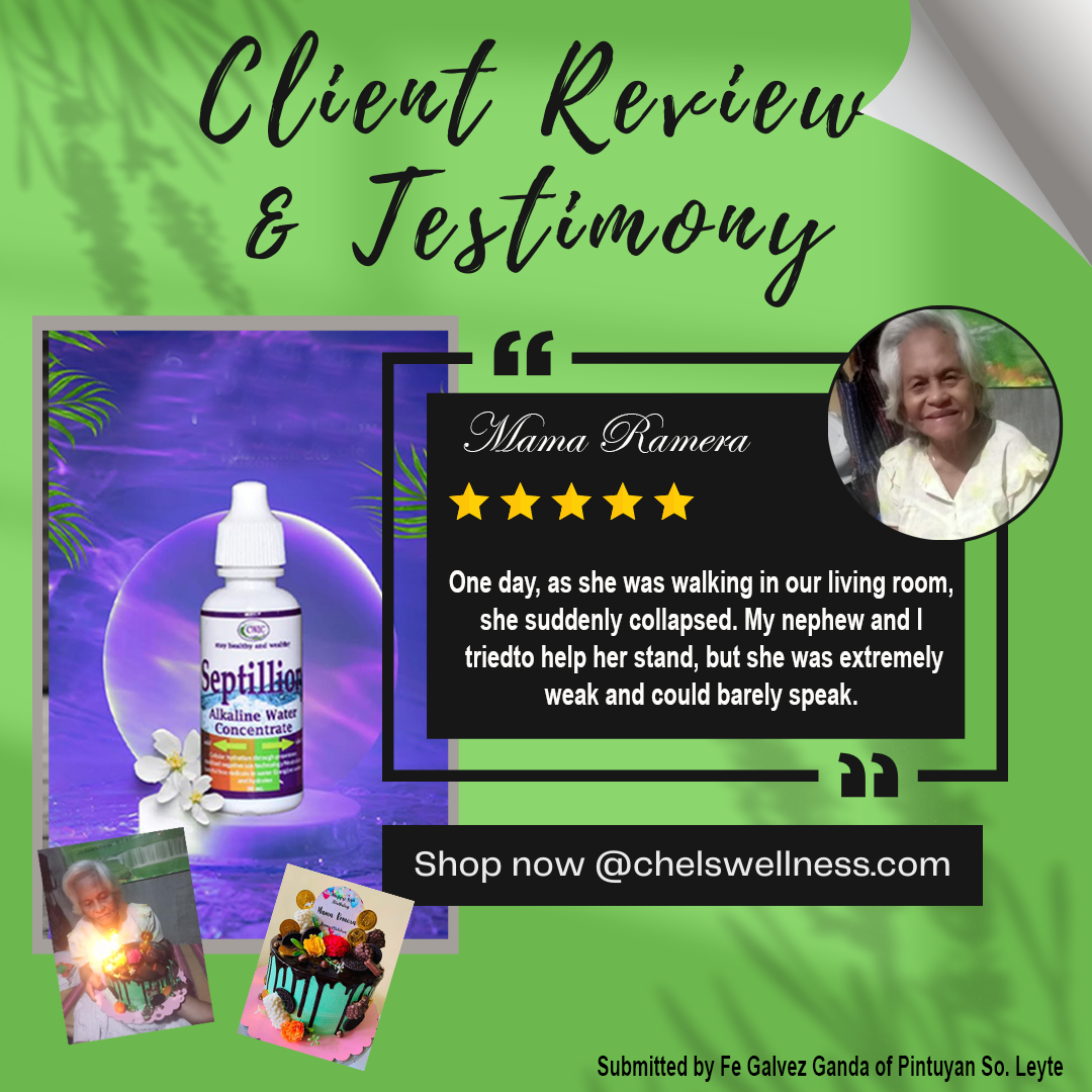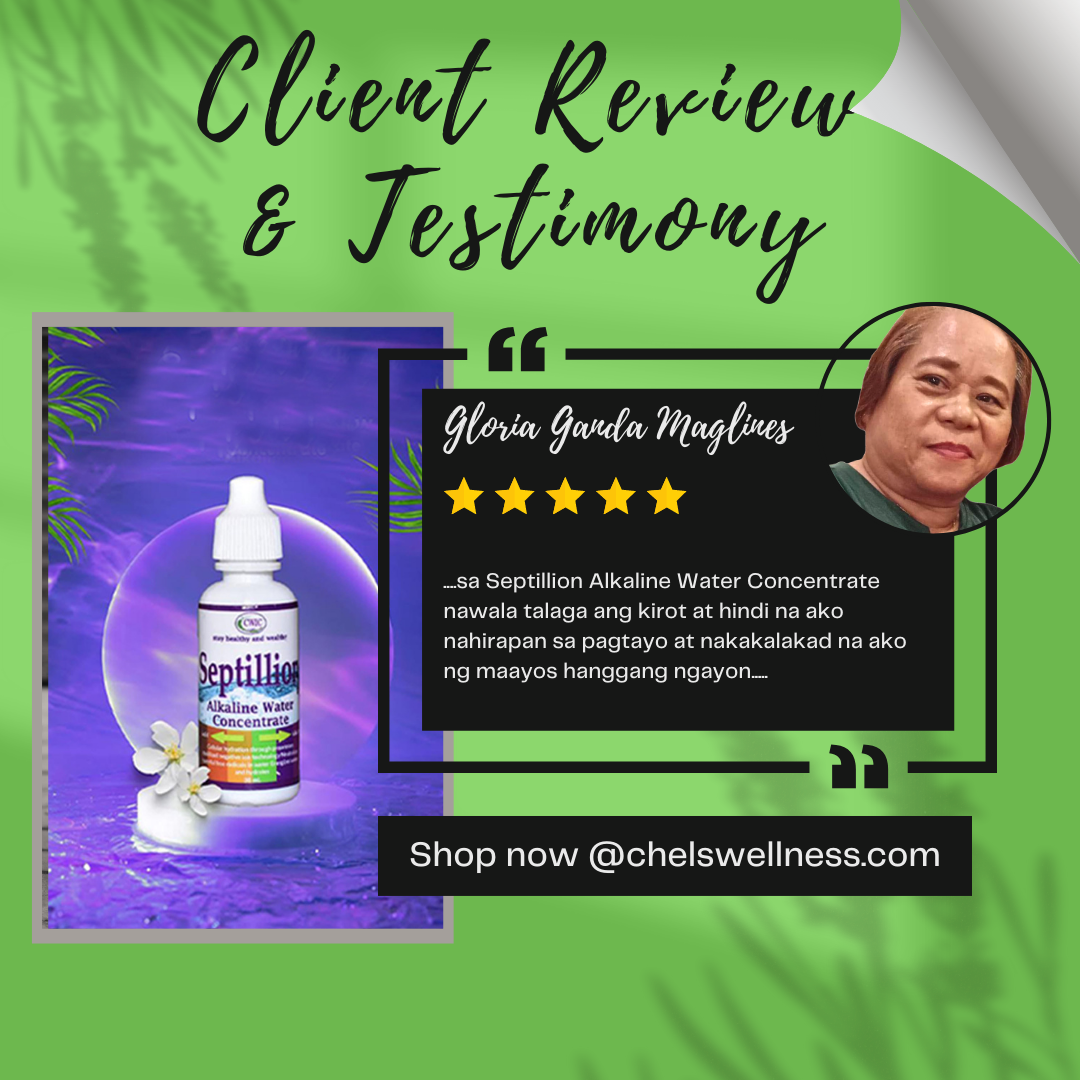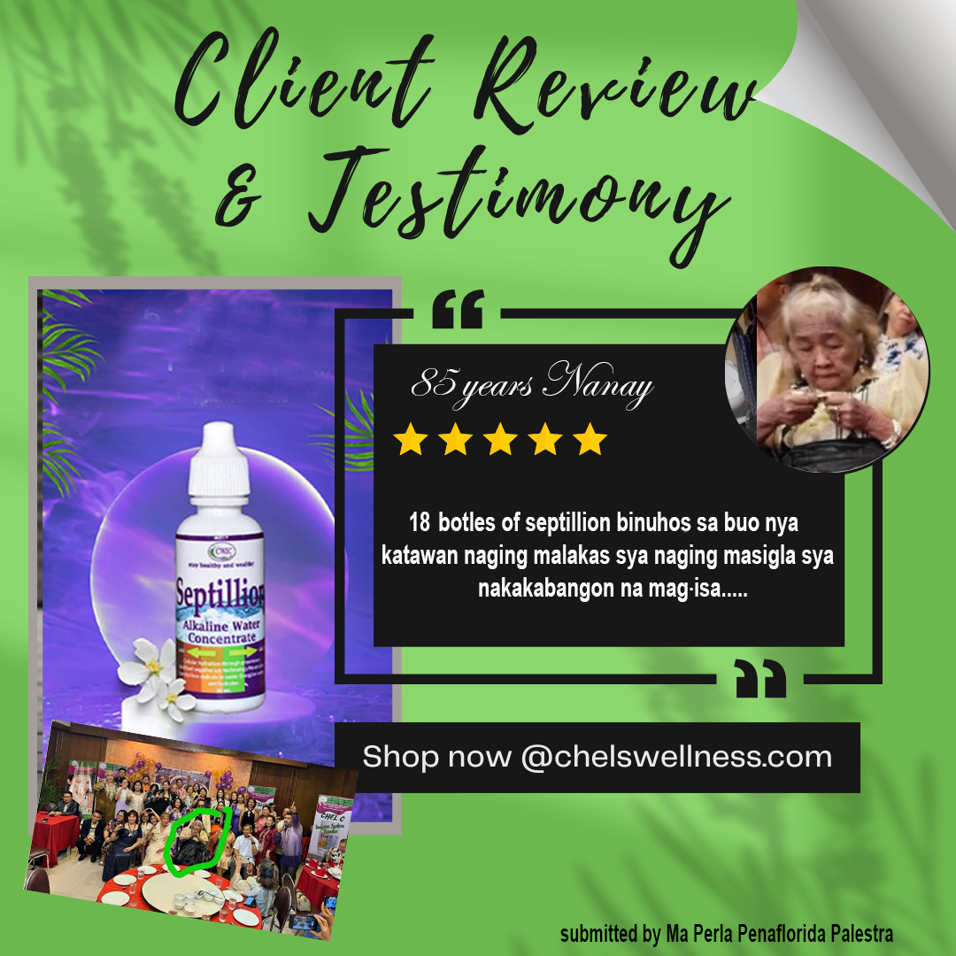 Good afternoon to all Septillionaires!!! Ito po ang testimony ko: Ako po ay si GLORIA GANDA MAGLINES, 60 years old, widow, nakatira sa Taytay, Rizal. Ako po ay nahihirapan sa pagtayo at paglakad ng malayo especially kung pa akyat at pa baba since February 2019 until July 2020. Dumating yung text nang kapatid ko na si Ms. Fe Ganda na magpa member daw ako sa business niya na yung Septillion Alkaline Water Concentrate, so nag tanong ako kung maka heal ba sa sakit ko, sabi niya e try mo. So nag order ako ng isang package lang. Pero before that, nagpa general check-up muna ako sa MANILA EAST HOSPITAL (Private hospital) dahil sa sakit ko sa kaliwang paa hanggang sa binti, ang sabi nang physician ko epa blood chemistry po ako, so ang results sa laboratory taas sugar, high blood, uric acid at cholesterol puro mataas, so nag recita sya nang veztenor for high blood, furic for uric acid, atorvastatin for cholesterol at metformin sa sugar ko at yung para sa paa at binti kc sabi nang doctor rheuma daw so nag recita siya nang celecoxib 20 tablets, at naubos nlang yung para sa rheuma ko hindi pa rin na naayos yung paa ko hirap pa rin sa paglakad at pagtayo, so nag take ako sa Septillion Alkaline Water Concentrate, 1 glass of lukewarm water plus 7 drops or 2 squirts 30 minutes before every meal, sa 3 days na pag inom ko sa Septillion Alkaline Water Concentrate nawala talaga ang kirot at hindi na ako nahirapan sa pagtayo at nakakalakad na ako ng maayos hanggang ngayon. At ngayon para sa HIGHBLOOD, uric, cholesterol ay metformin ang mine-maintain ko at yung Septillion Alkaline Water Concentrate. Thanks to Septillion Alkaline Water Concentrate and to OUR ALMIGHTY GOD.